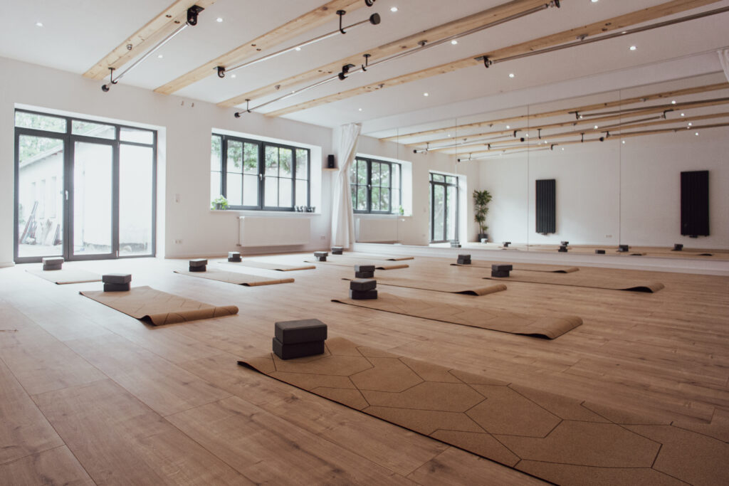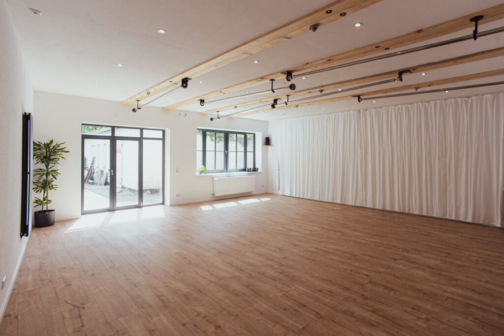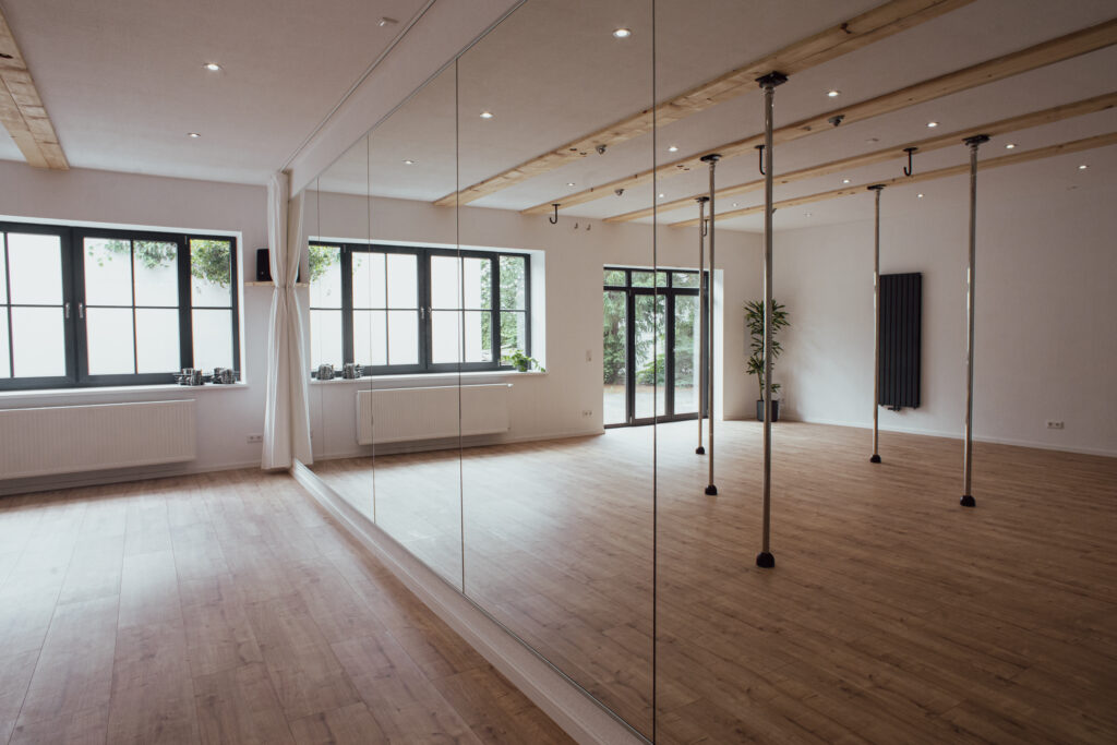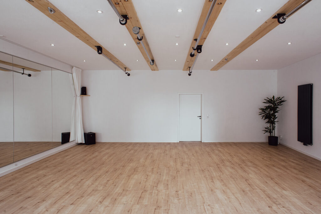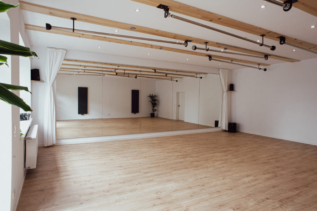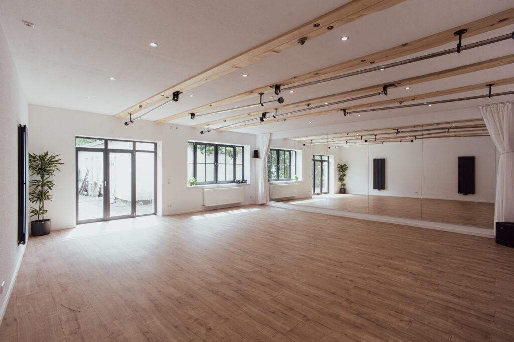 In der ca. 64 m² große Multifunktionshalle stehen eine hochwertige Soundanlage mit Bluetooth Verbindung und eine große Spiegelwand, die bei Bedarf verdeckt werden kann, zur Verfügung. Das Studio eignet sich damit ideal als Kurs- und Workshopraum und bietet vielseitige Nutzungsmöglichkeiten.